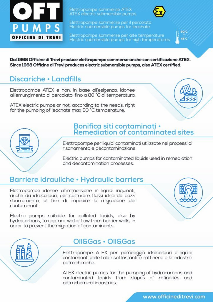 Officine di Trevi specialized in manufacturing electric submersible pumps for contaminated liquids, hydrocarbons, landfill leachate and water, Atex or non-Atex. The OFT brand includes submersible pumps ranging from models with a diameter of 3'' and 4'', drainage models and surface electric pumps.
